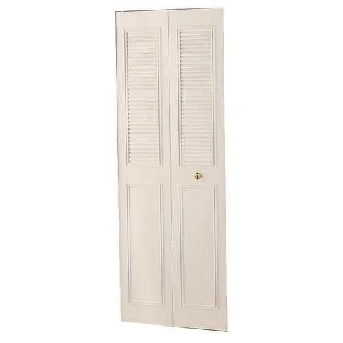 This non-handed bi-fold door is made from 24-gauge steel. It includes a half-louvered style, a baked enamel exterior, and complete track and hardware.