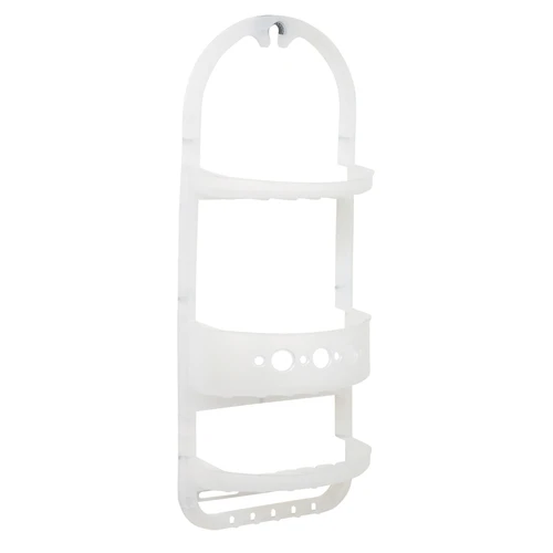 Use the Frosted Plastic Over the Shower Caddy to organize and remove clutter from your shower. With its two large shelves and deep basket, adequate storage space should not be an issue in your shower. All level are self-draining, which allows your shower items to dry. Additionally, this premium caddy features hooks for hanging storage of razors, shower poufs, washcloths and more. Cleans easily with a damp cloth.